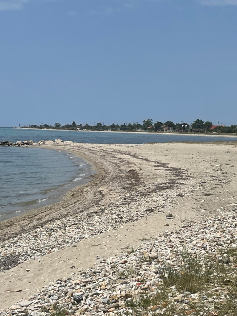 Het strand bij Nea Irakleia Zo tegen zessen rijd ik het dorpje in en drink daar nog een overheerlijke cappuccino bij het plaatselijke koffiehuis. Ik maak nog een wandeling rond het dorpje, heerlijk dat platte land van Griekenland. De vijgenbomen dragen vrucht en dat geeft een zoetige geur. Ruim op tijd rijd ik naar het vliegveld van Thessaloniki. De vlucht uit Nederland heeft vertraging dus ik moet nog wat langer wachten en rijd naar een dorpje in de buurt om nog rustig een uurtje te kunnen lezen. Dan is het zover het vliegtuig is aantocht. Kort na de landing staat Jos in de aankomsthal. Samen gaan we nu verder. Auto van de parkeerplaats tegen 6 euro parkeerkosten. Ja die Grieken weten er ook raad mee. Schaarste (ruimte) moet betaald worden is dan het economische principe. We reden de avond tegemoet en de stad in naar ons hotel. Daar komen we tegen 10 uur aan. Lekker ff uitpuffen en morgen weer verder…..