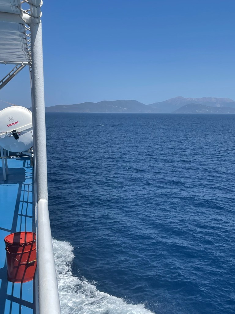 Op de achtergrond ligt de ‘Capitan Aristidis’ al te dobberen Het is een uurtje varen naar Kefalonia. Er staat een straffe wind dat zich ook in de bewegingen van de boot laat merken. Rond 17:45 uur komt Fiskardo, de oostelijke havenplaats van Kefalonia in zicht.
