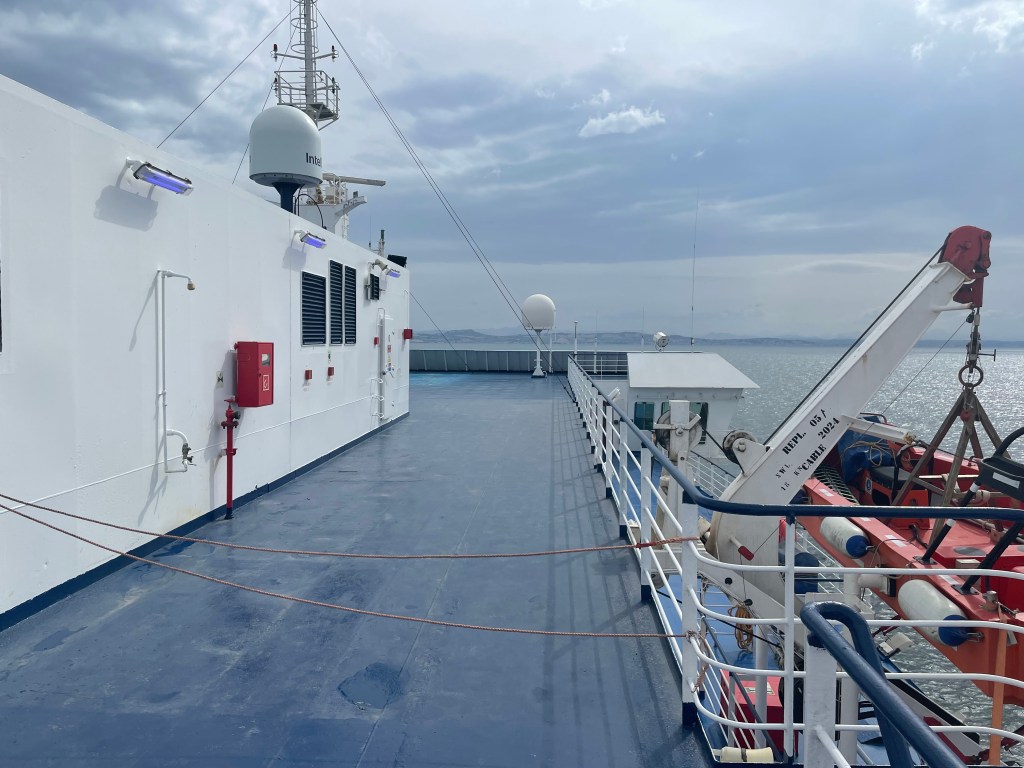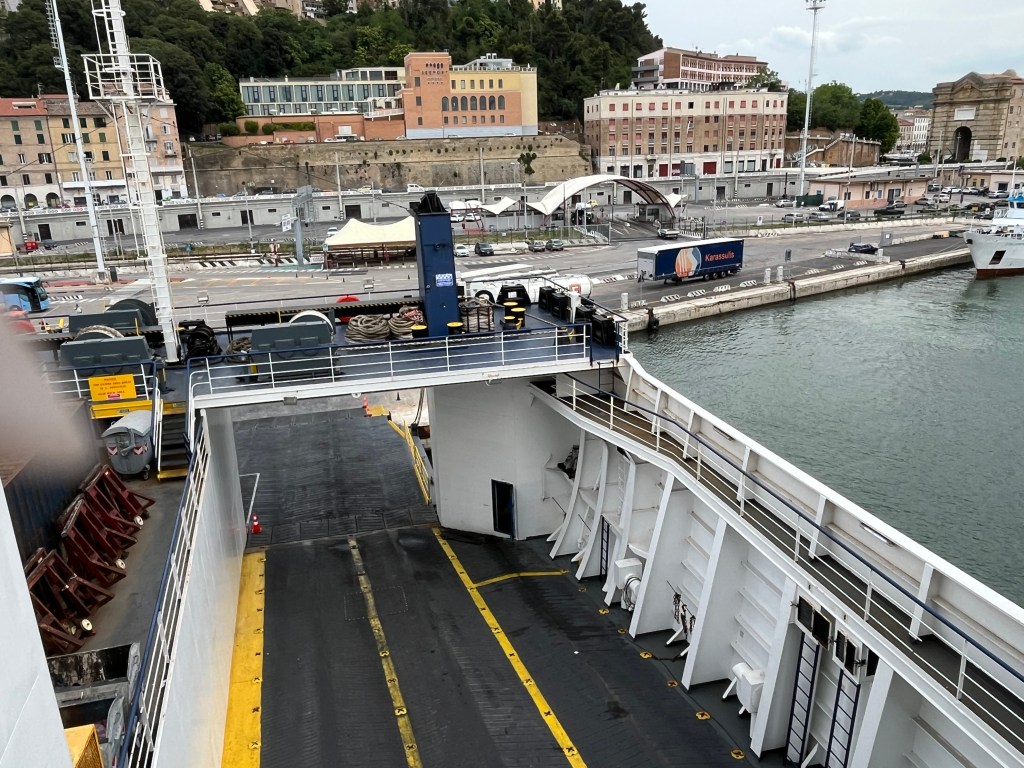 Vannacht met het geluid van stampende scheepmachines in slaap gevallen. Deze ochtend met hetzelfde geluid weer wakker geworden. Dan schuif je de gordijnen van je cabine open en wat zie je dan? Alleen maar zee, geen land in zicht…….. Op googlemaps kijken om te zien waar je ongeveer op zee bent. Uh.. nee hoor op zee staan geen 5g masten. WiFi aan boord kan tegen kosten maar ook zeer beperkt en niet voluit surfen. Dat laten we dan maar zitten. De prognose is dat de Venezia tegen 17:00u de haven van Ancona binnen zal lopen. Na het wakker worden zijn wij gaan ontbijten en daarna even een rondje op de boot gelopen. Er staat een flinke wind aan dek en dat nodigt niet uit om daar te gaan zitten. Al snel kwamen wij toen binnen terecht in een lounge waar in ieder geval goede cappuccino te krijgen is. De rest van de dag is het lezen, puzzelen, lezen en weer puzzelen en na enige tijd ter afwisseling de benen strekken. Aan het eind van de middag komt (eindelijk….) Ancona in zicht, met daarboven een behoorlijk wolkendek.