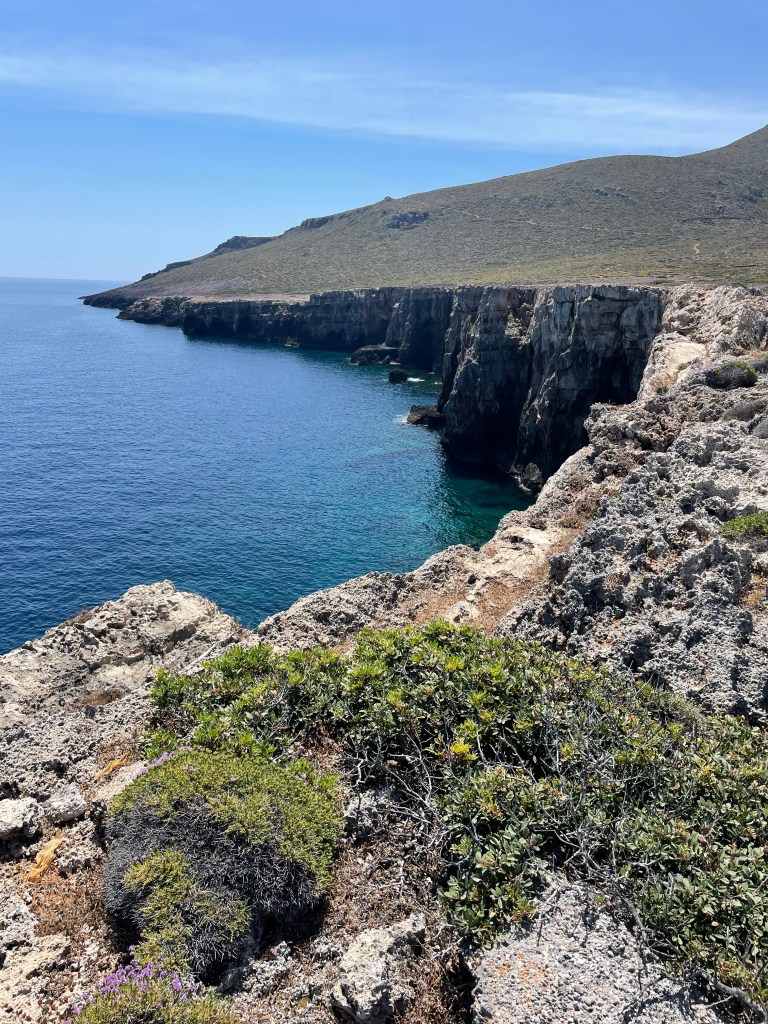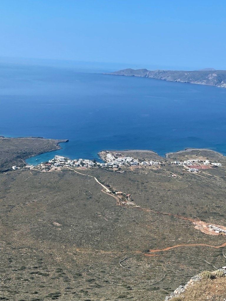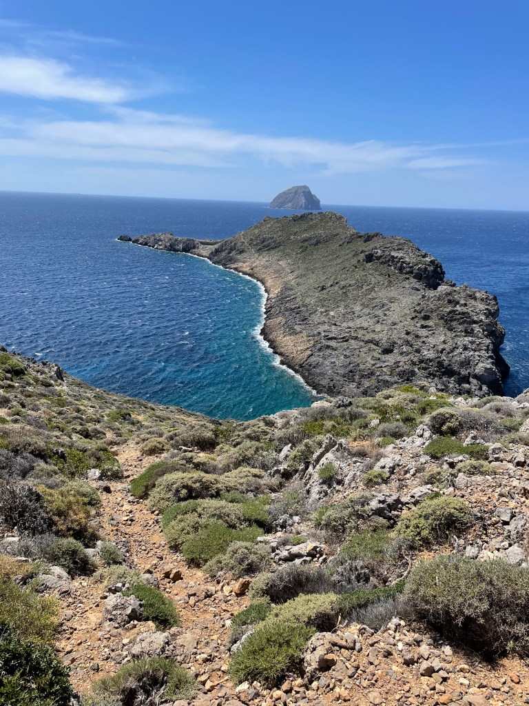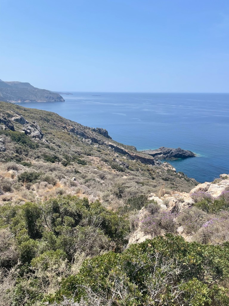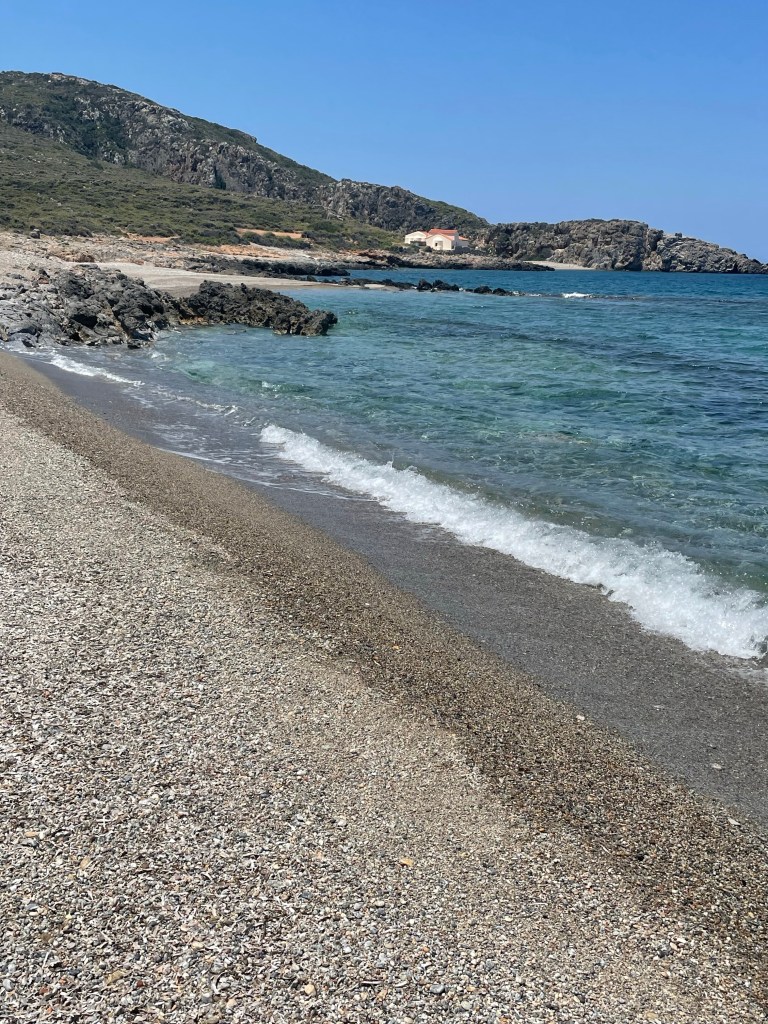 Toen werd het teruglopen met het nodige klimwerk naar de eerdere splitsing. Vanaf daar ben ik de weg ingeslagen naar de baai Feloti. Dat werd weer een lange afdaling naar weer een soort van niemandsland. Een gebouwtje met een strand en dat was het……