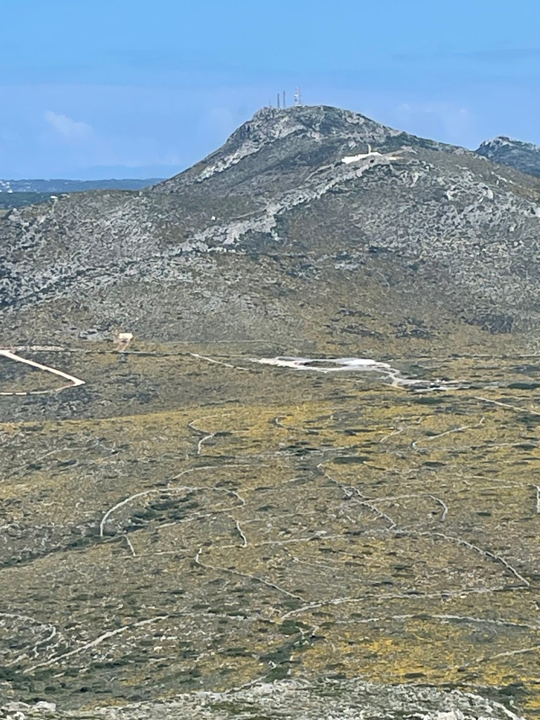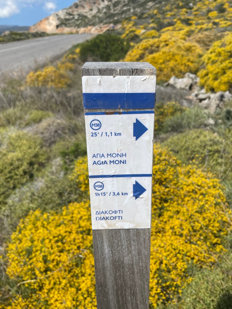 Het was gisteren een prachtige wandeldag, volop zon, een windje en lekkere temperatuur. Ik ben op tijd gestart. Het eerste deel van de trail ging naar de kerk van Agios Georgios tou Vounou (Sint George op de berg). Deze kerk aan de oostzijde van het eiland is vanaf het balkon van het appartement duidelijk te zien. Het eerste deel van deze trail naar Agios Georgios heb ik al eerder gelopen in september 2021. Van toen herinner ik mij dat het lastig was om het begin van de trail (route M19) te vinden. Dat was dit jaar niet anders.