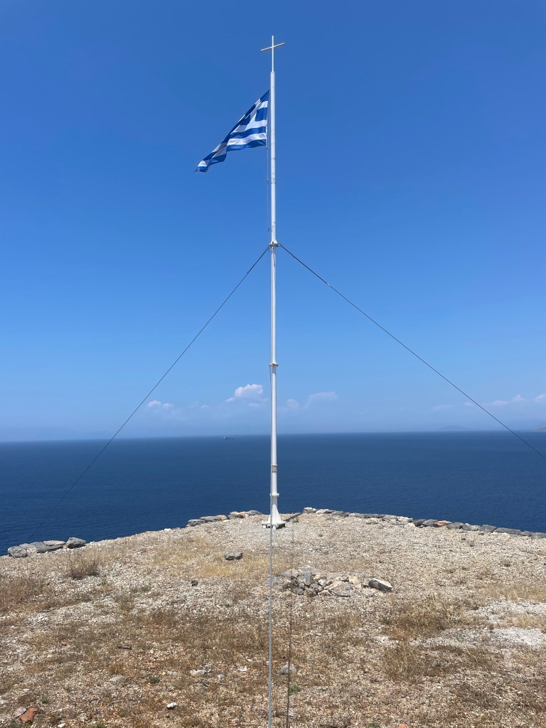 Vandaag was het weer duidelijk anders, het zonnetje scheen en de temperatuur was zeer aangenaam. Hoewel de afgelopen twee dagen was het weer voor mijn gevoel wat on-Grieks, bewolkt, regen en kil. De enige trui die ik bij me had, had ik ook echt nodig. Maar gelukkig dat ligt nu weer achter mij en dan kan je dat snel vergeten. Het weer van vandaag nodigt uit tot wandelen. De geplande route is mij gedeeltelijk wel bekend. Via het kustgebied naar Agios Nikolaos Beach, de kapel van Agios Nikolaos (St. Nicolaas) aan het strand en dan klimmen naar Kaap Spathi. De kaap is het noordelijkste punt van het eiland, waar ook een ruïne ligt van een oud zendstation en niet te vergeten waar de vuurtoren (Lighthouse of Fanari – resp. Engels/Grieks) van Moudari staat. Vandaar gaat het weer terug naar Platia Ammos.