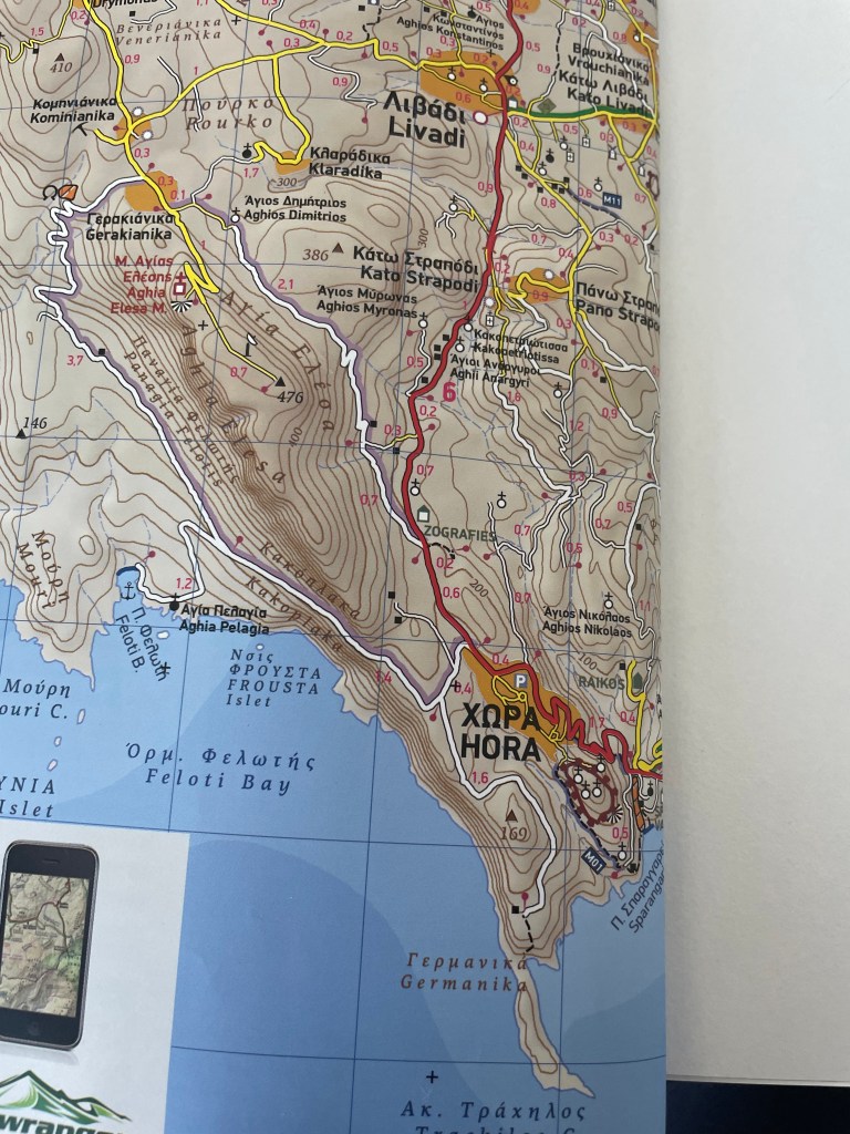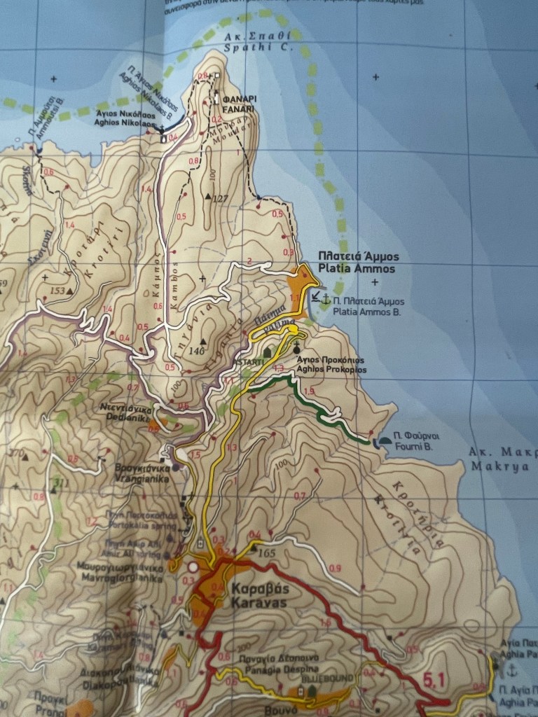 Op naar de volgende trail. Het laat zich niet moeilijk raden denk ik dan. Dat wordt over een paar dagen het zuidelijke puntje van het eiland, Kaap Trachilos.