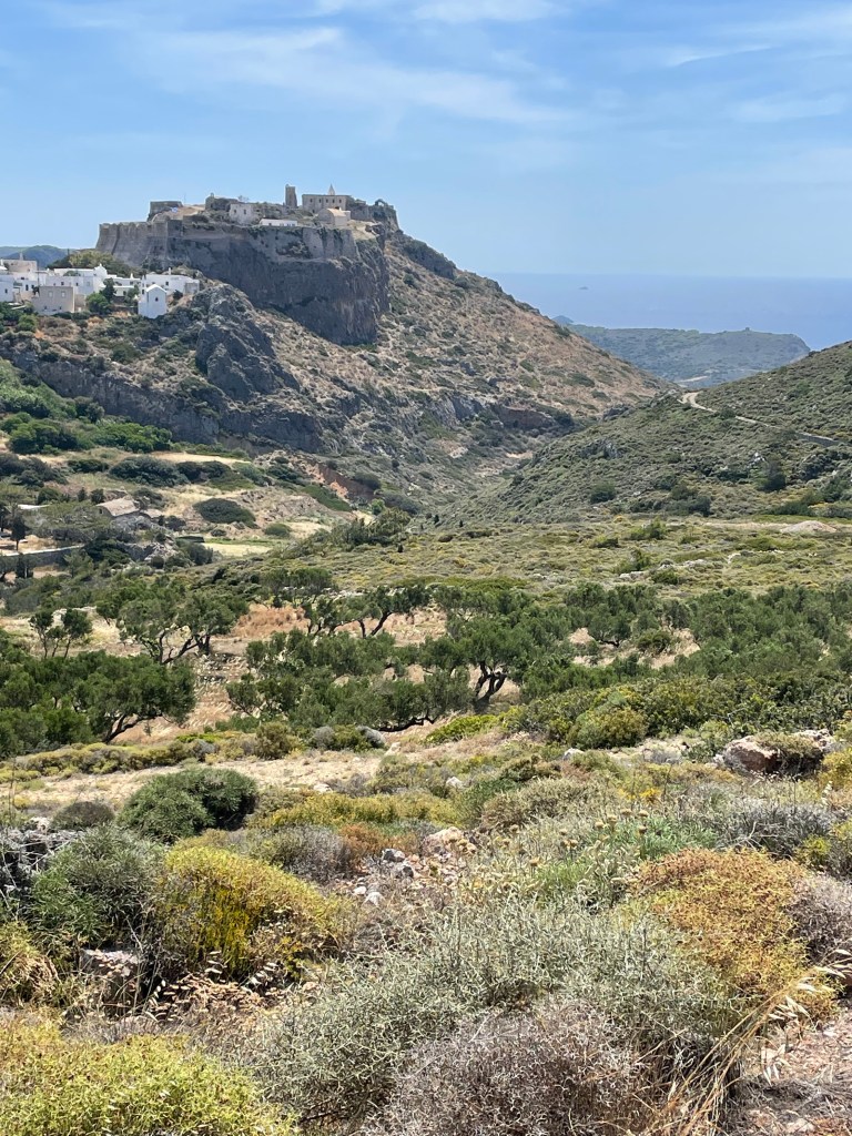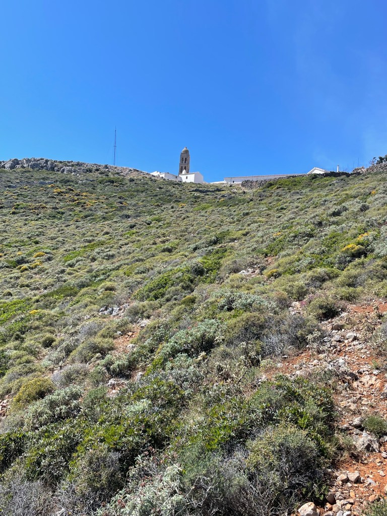 Het begin van de wandeling ging voortvarend want binnen 45 minuten was ik vanuit Avlemonas, via het nu wel snel gevonden pad (M19), geklommen richting Agios Georgis (kerkje). Bij die klim merkte ik al dat het vandaag, onder invloed van het warme weer, wat moeizamer ging. Dus veel zweten en ophoping van melkzuur in de benen. Op het plateau voor de klim naar het kerkje ben ik linksaf gelopen richting Aghia Moni. Dat eerste stuk is een mooi en breed pad, daarna komt de klim naar Aghia Moni. Een steile klim waar ik echt een aantal keren rust moest nemen. Na het klooster werd iedere afdaling en klim, richting Diakofti en Avlemonas, zwaar over de eindeloze geitenpaden met heel veel stenen waarvoor je schoenen moet optillen.