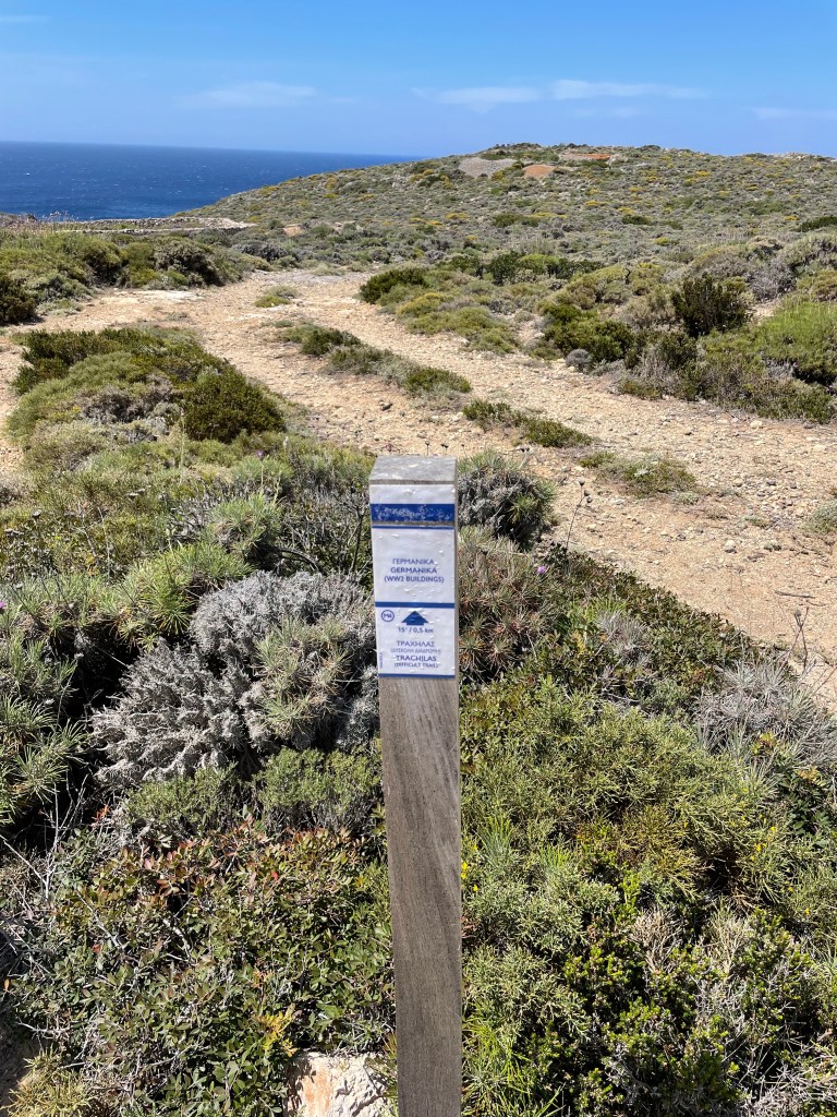 Op deze splitsing moest ik een keus maken. Het werd eerst links af naar kaap Trachilos. Een afdalend pad naar het uiterste zuidelijke puntje van het eiland. Dat liep best wel soepel tot een 0,5 kilometer voor de kaap. Bij de resten van een Duits fort uit WOII stond een paaltje met de richting naar Kaap Trachilos met de waarschuwing dat dit een moeilijke trail was.
