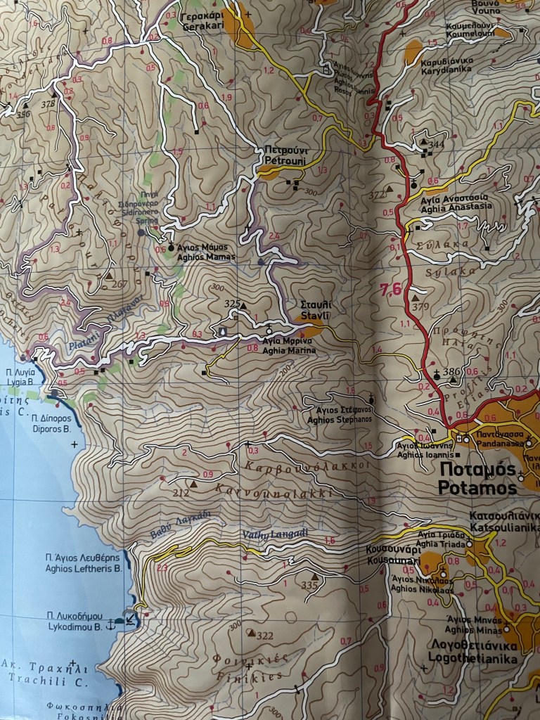 Het plan deze vakantie is om weer de nodige trails op het eiland te lopen. De meeste uitgezette routes op het eiland heb ik inmiddels afgestruind. Het blijft daarom een uitdaging iets nieuws te vinden. Zo vond ik deze keer op de kaart een route die ik nog niet had gelopen. Na een paar dagen van bijkomen heb ik vanochtend de wandelschoenen aangetrokken om deze route van Avlemonas naar Diakofti (6 kilometer) te lopen. De route bestaat al sinds 2017 en is genaamd ‘Petros Kalligeros’- trail. Mijn eerste gedachte was welke heilige is er van stal gehaald om deze trail naar te vernoemen. Een zoekslag op internet leerde mij dat de trail is vernoemd naar de te vroeg overleden eigenaar van de dorpswinkel in Avlemonas. Ik heb de man niet gekend maar dat zijn naam verbonden is aan deze trail vond ik een mooi initiatief. In deze trail leeft zijn naam voort…..
